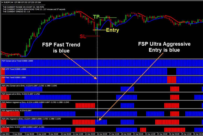 For FSP Aggressive Entry, we don’t need any higher timeframe confirmations and can place them as soon as we have a signal. For FSP Ultra Aggressive Entry, we have to use the FSP Fast Trend to confirm our entry and of course we need to have that huge move in the opposite site of our entry signal direction.