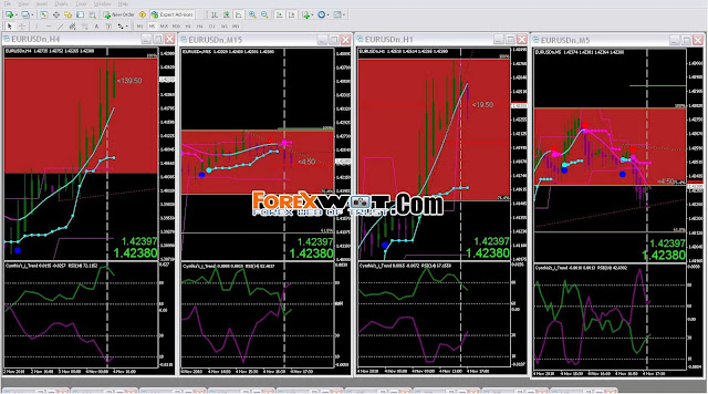 When you are looking at a currency pair to trade, you first look at the top 1 or 4 hr chart to determine the major trend.. then look down at the next chart underneath to see the medium trend, and then look down at the lower chart to see the faster trend.