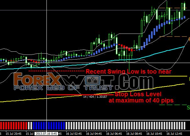 - Set the Stop Loss below the most recent swing low or at most 40 pips away from the entry level.For the example below, the recent swing low is less than 10 pips from the entry level.