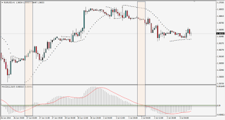 In the example graph below, the pair that will be used is the EUR/USD with a 1 hour chart’s where at the bottom of the graph, while the MACD is an indicator at the top of the graph is Parabolic SAR indicator with green dotted line.