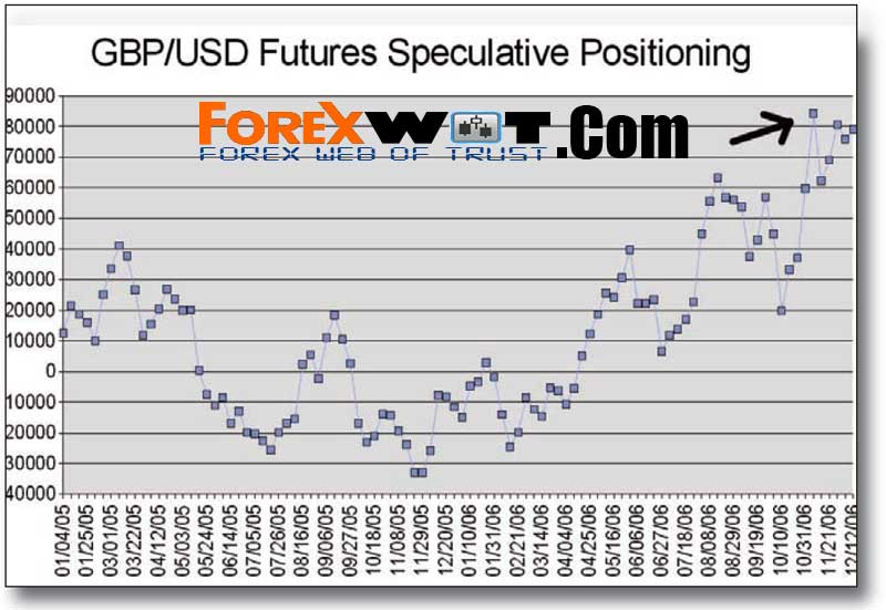 An example of this was played out in the week through November 13-17, 2006. The COT report that was released on November 10 showed that, as of the previous Tuesday on November 7, large speculative funds upped their net GBP longs to a multi-year high of +84,280 contracts, a figure which clearly shows up as an extreme